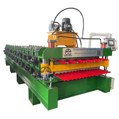 Doppelschichtrolle, die populären Verkauf der Maschine in vielen Ländern, allgemeine Überdachungsrollende Stärke des blattes von 0.3-0.6 Millimeter, materielles Material des Gebrauches bildet PPGI (vorgestrichener galvanisierter Stahl)